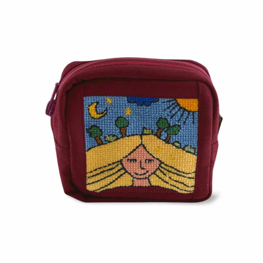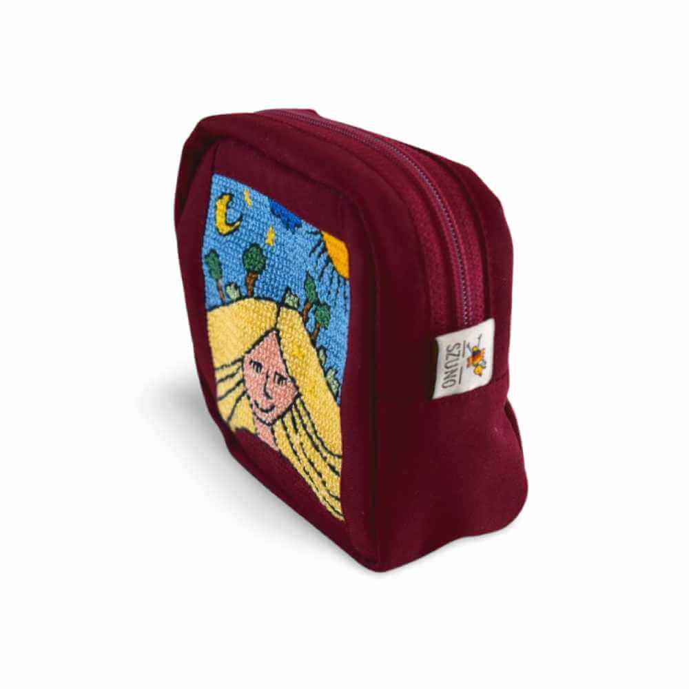 Igazgyöngyös gyerekrajzok ihlette keresztszemes hímzéssel díszített patchwork tisztasági csomag tartó. Praktikus, divatos, cipzárral könnyen nyitható. Kényelmesen belefér 10-12 db betét, ezek mellé tampon, vagy akár nedves törlőkendő.