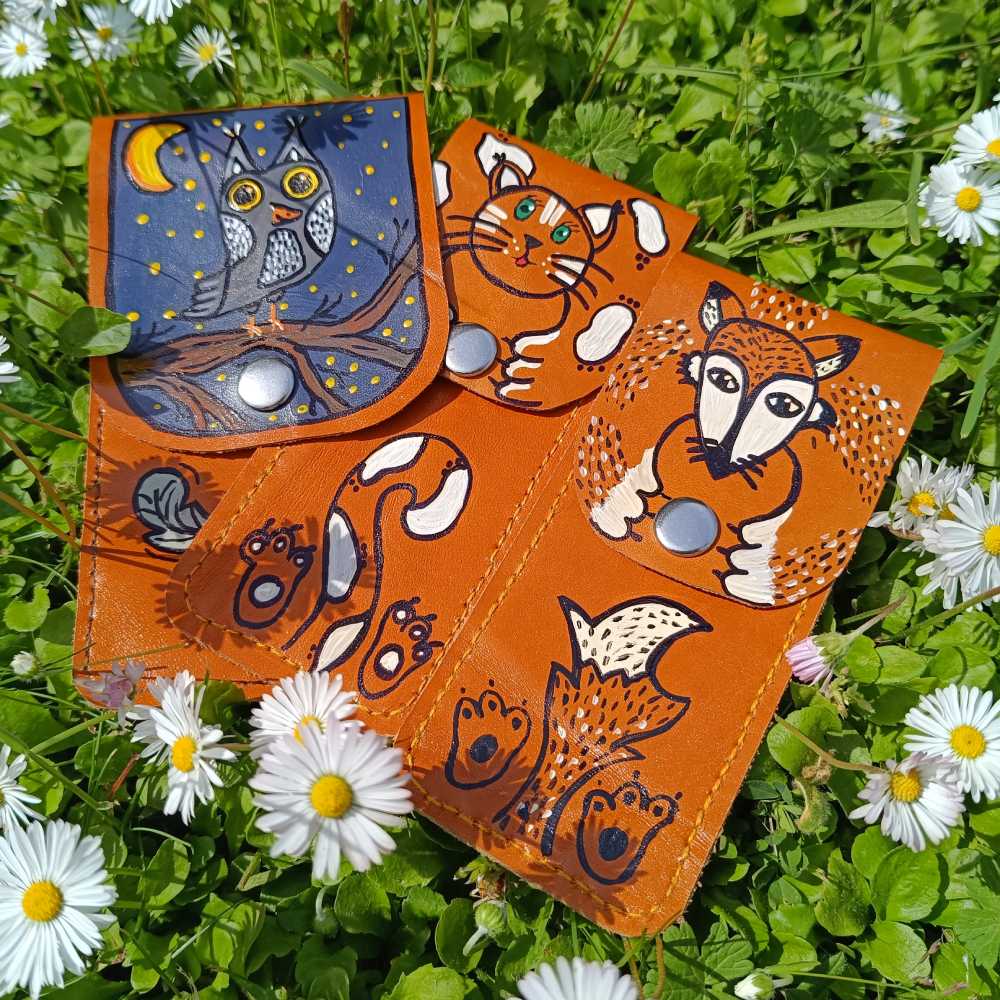 Puha borjúbőrből kézzel készült, igazgyöngyös gyerekrajzból vett mintával festve.