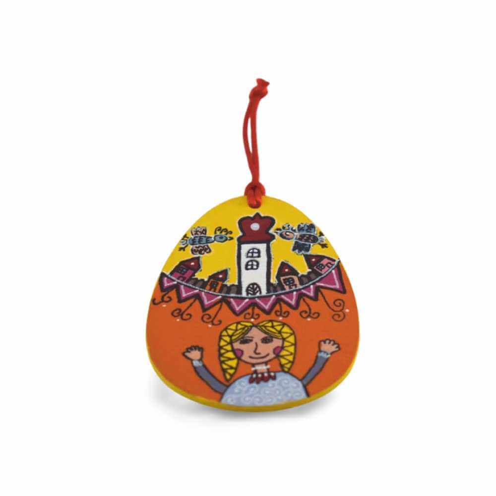 Igazgyöngyös gyermekrajzok ihlette mintával díszített fa dísz. A terméket a toldi Szuno műhelyben dolgozó asszonyok kézzel festik, ezért minden darab egyedi és nincs két egyforma belőle. Anyagának köszönhetően strapabíró, a lakkozásnak köszönhetően pedig időtálló.